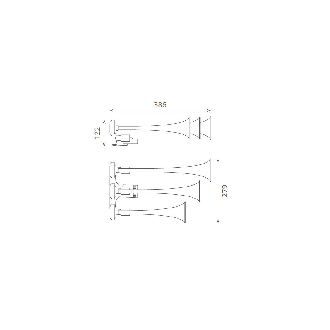 SEGER fanfarria neumática triple, barriles de metal - acabado cromado, válvula de solenoide de 24V, acoplador de aire de conexión rápida, conectores eléctricos, soporte de montaje.