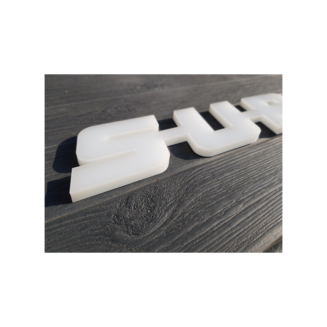 Emblema de plástico SUPER con dimensiones: 40 x 6 x 0,8 [cm]. El producto se monta sobre todo en vehículos SCANIA en el capó. Se monta con cinta adhesiva de doble cara o pegamento (no suministrado).