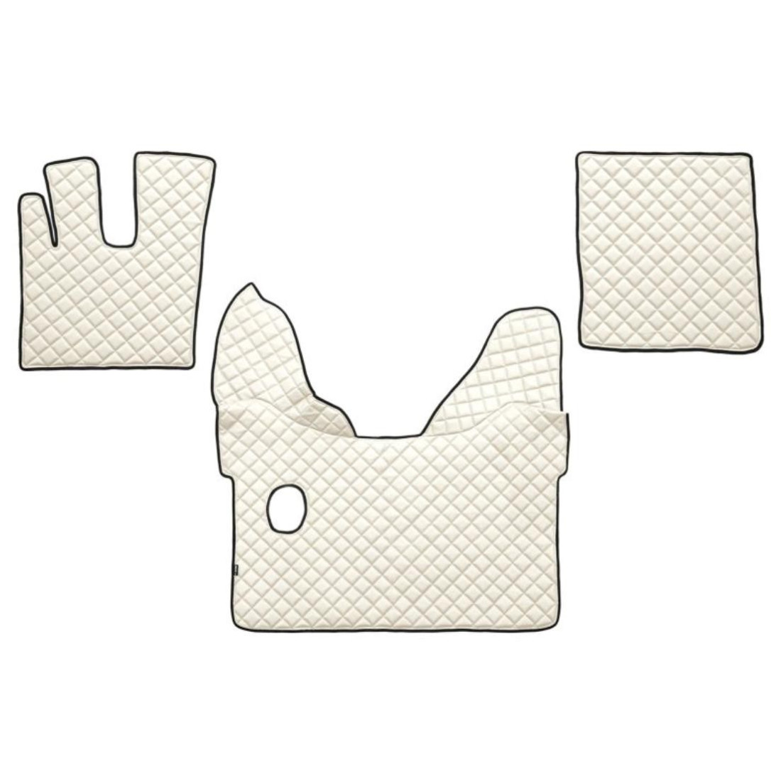 PRODUCTO OUTLET! Producto nuevo, nunca usado. Conjunto de alfombras realizadas en ecopiel color beige. El set incluye una alfombra para el túnel central y dos alfombrillas para los pies. Diseñado para DAF XF 105/106 (manual, Webasto pequeño - sin Webasto). Código de fabricante FL26. Embalaje de repuesto.