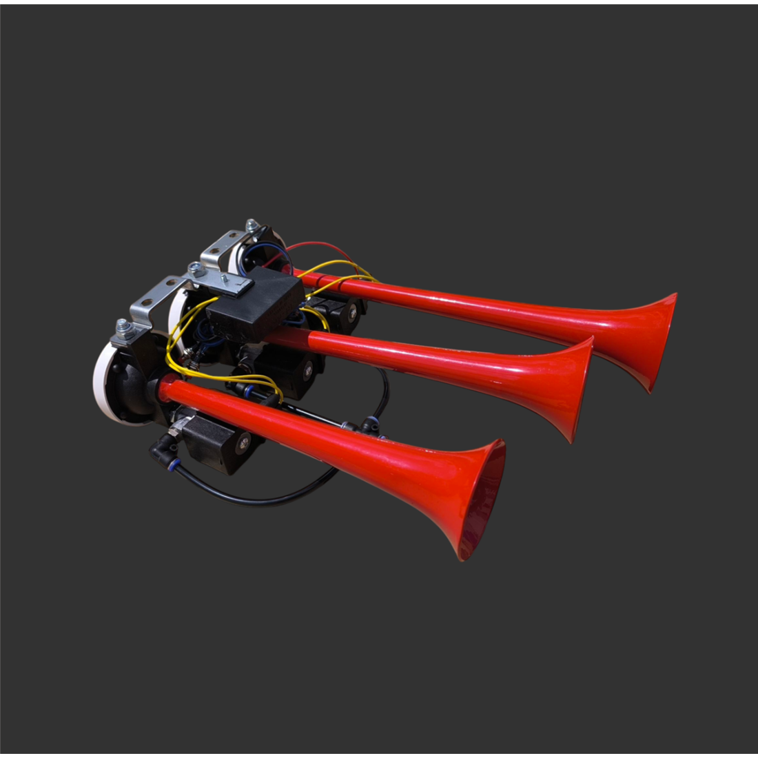 Fanfare pneumatique, 3 barillets finition métal rouge, électrovanne 24V, déconnexion rapide d'air, connecteurs électriques, support de montage.