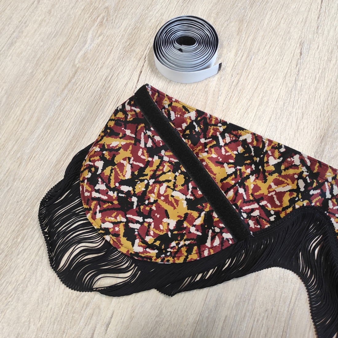 Windshield valance (outside and inside made of yellow plush fabric in Danish style DP03, black fringes) with Velcro mounting.
