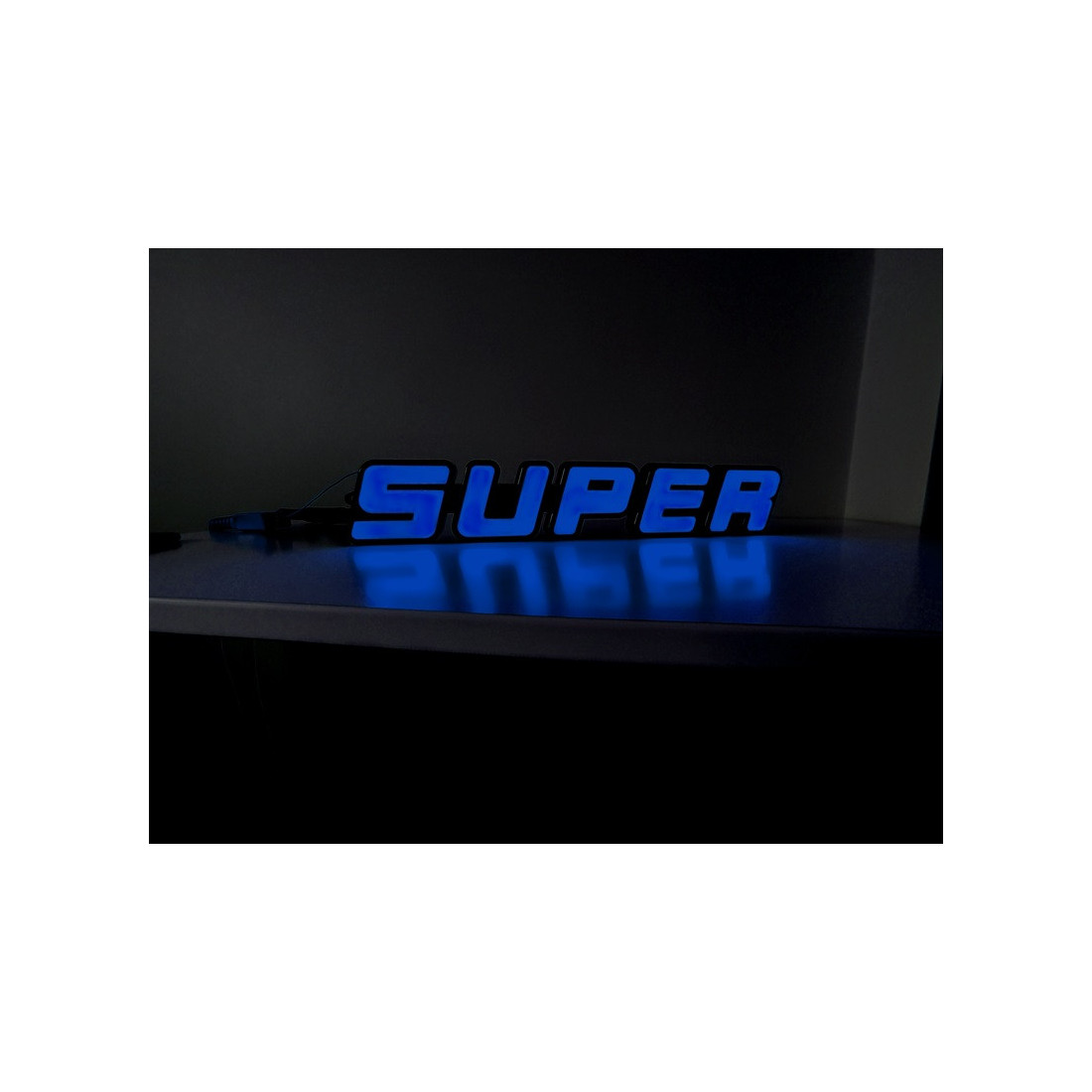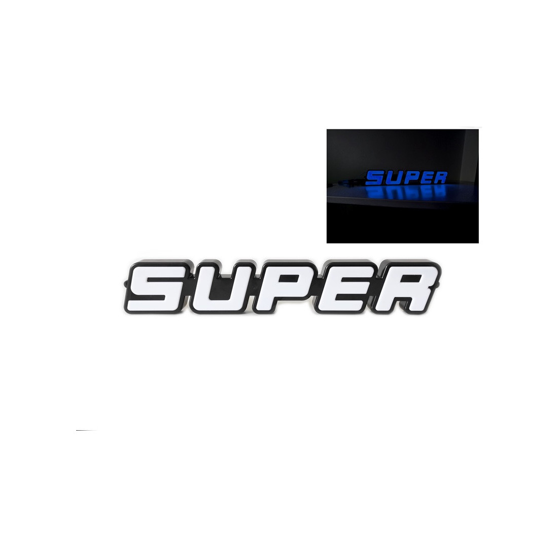 24V S-U-P-E-R emblem with BLUE LED lightning, mostly fitted on front grill. Easy fittiny by two screws (in set). Electric cable -r ed-black "+", black "-". Tuning part.