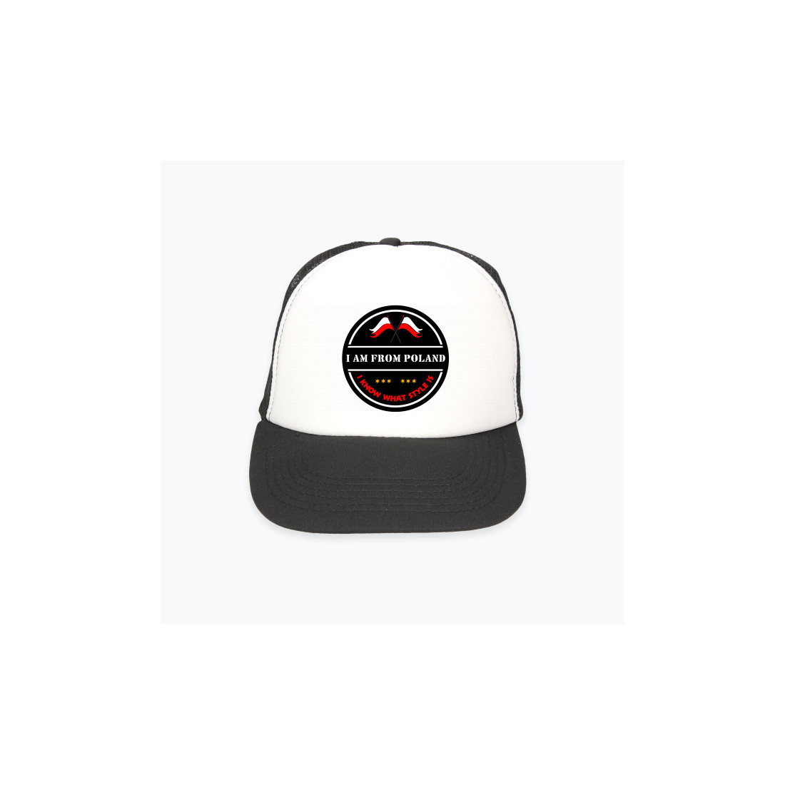 Universal black and white baseball cap, so-called trucker cap - "I'M FROM POLAND AND I KNOW WHAT STYLE IS"