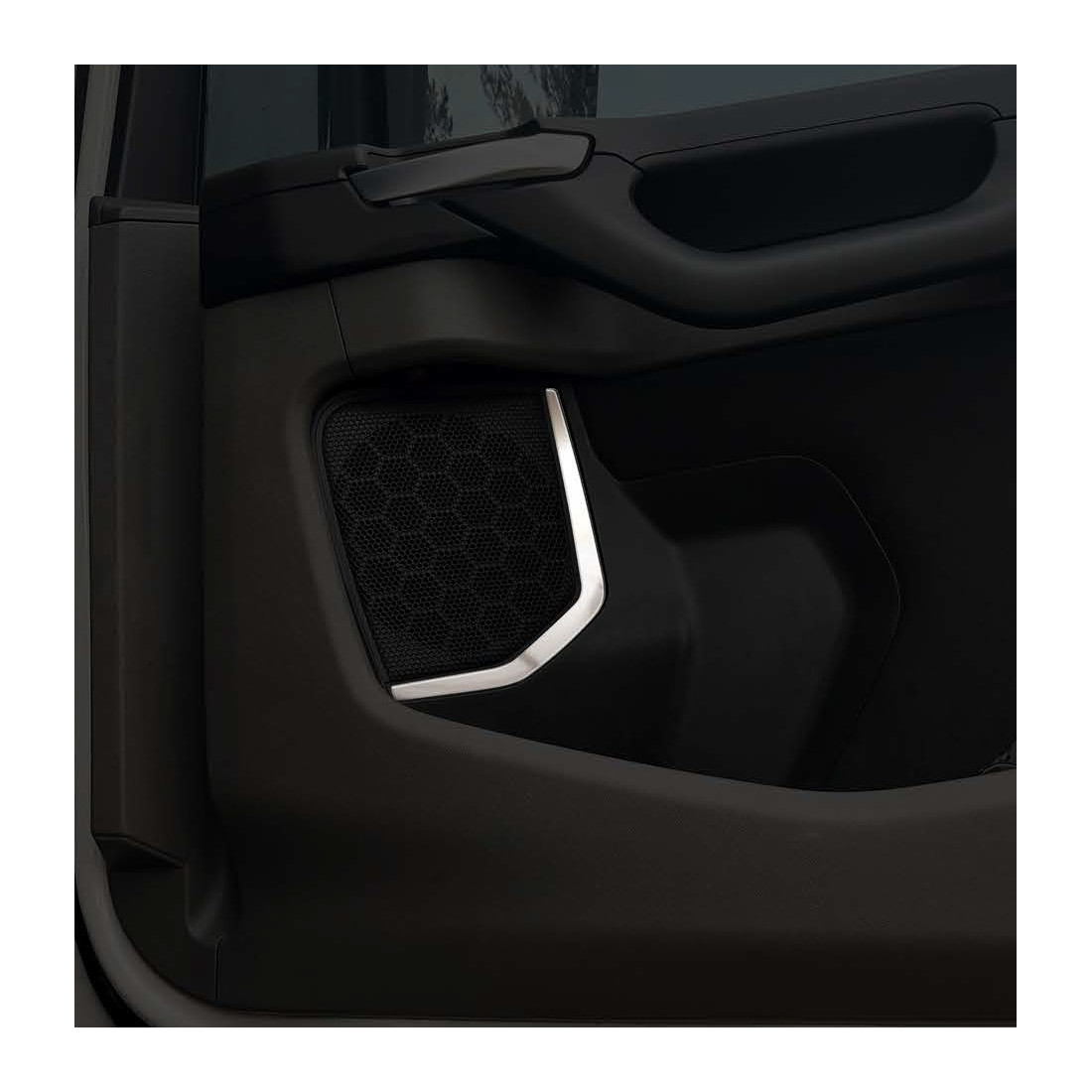 Side door speaker decors, made of stainless steel, for Scania Next Gen R/S.