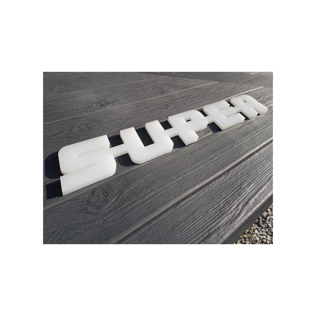SUPER plastični amblem, dimenzije: 40 x 6 x 0,8 [cm] . Proizvod se najčešće montira na poklopac motora SCANIA vozila. Montaža pomoću dvostrane trake ili ljepila (nije uključeno).