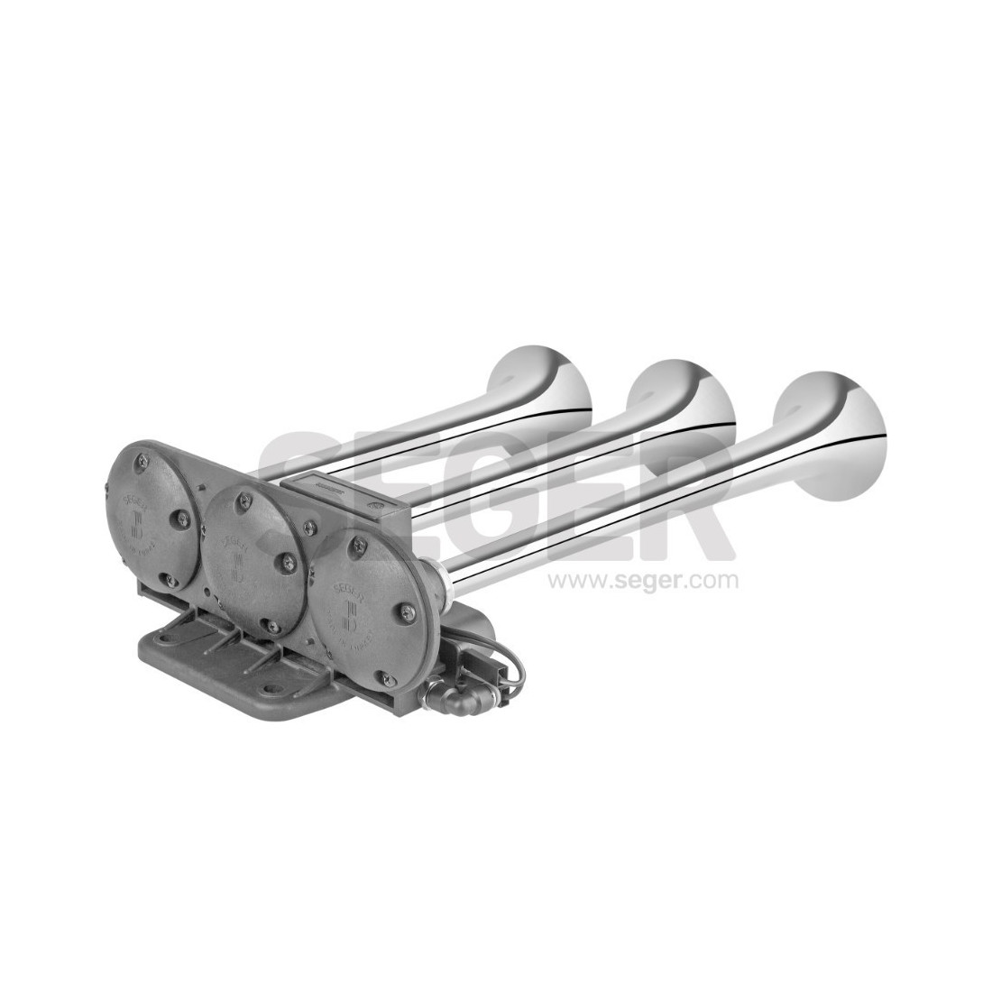 SEGER trostruke pneumatske fanfare, metalne bačve - kromirana završna obrada, 24V solenoidni ventil, brzi zračni priključak, električni priključci, nosač za montažu.