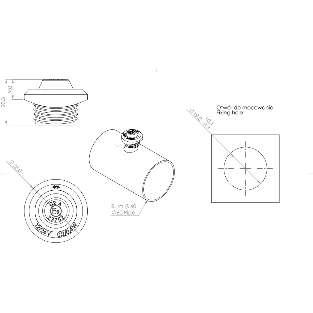 Postavite svjetiljku na tijelo tako da je utisnete u otvor promjera Φ19 u cijevi Φ60.