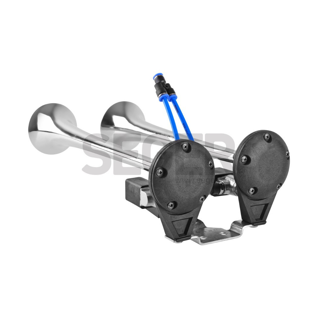 SEGER dupla pneumatikus fanfár, fémhordók - krómozott kivitelben, 24V-os elektromos szelep, gyorscsatlakozós légcsatlakozó, kihozott elektromos csatlakozók, rögzítő konzol.