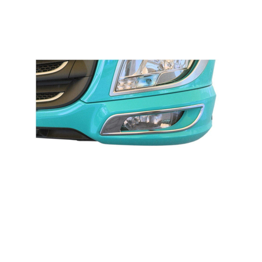 Krómozott lökhárító ködlámpa keret készlet. Dombornyomott termék (profilozott, domború) tükörfényesített rozsdamentes acélból (304). 2013-tól DAF XF E6 autókhoz tervezték. Egyszerű összeszerelés a készletben található kétoldalas ragasztószalaggal. A készlet L+R oldal ára. Nem eredeti tartozék alkatrész.