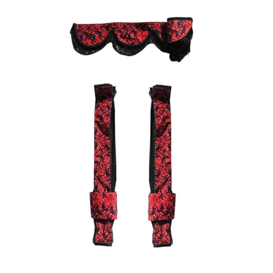 -szélvédő feletti karnis (kívül és belül piros plüss anyagból, DP03RED, fekete rojtokkal) tépőzáras rögzítéssel, a karnis méretei 226x21cm,