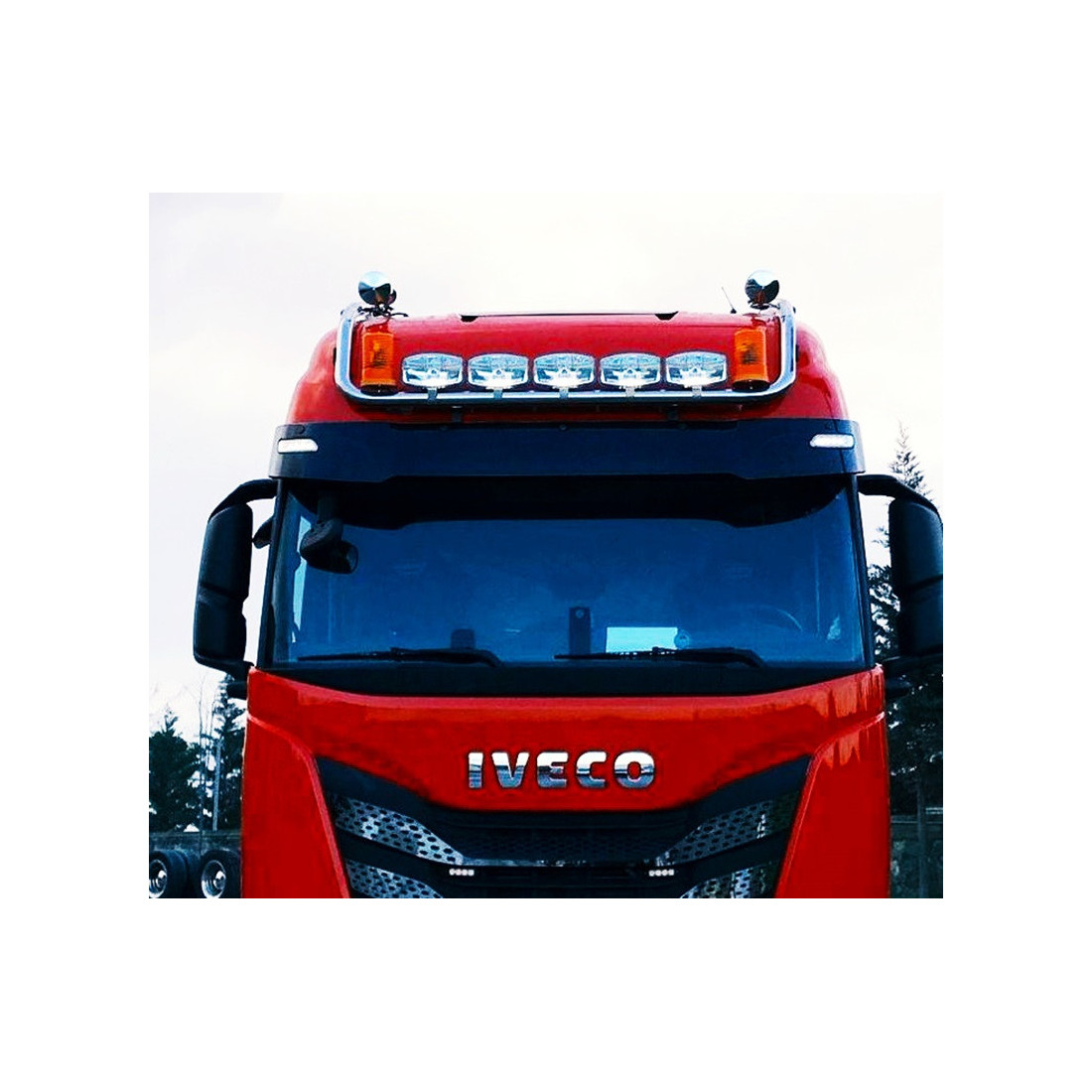 Rozsdamentes acélból (tükörfényes inox 304) készült tetőkárpit az IVECO S-WAY járművekhez. A készlet tartalmaz egy rögzítőkészletet - konzolokat, csavarokat és négy tartókonzolt a halogén lámpákhoz, amelyek elhelyezését Ön választhatja meg.