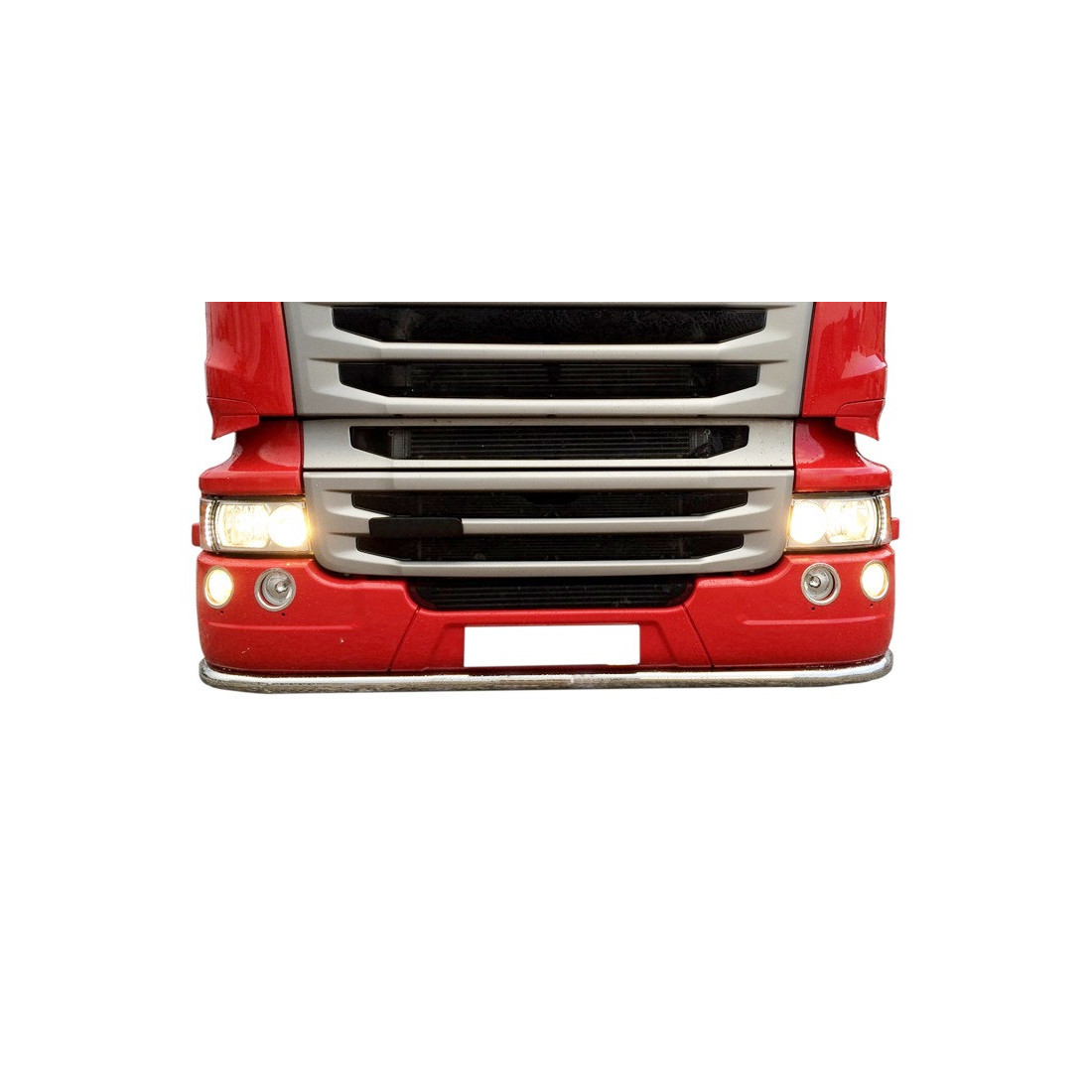 Tubi paraurti in acciaio inox (inox 304 lucidato a specchio) per SCANIA serie R 04-18 anni con paraurti SMALL (vecchio modello fino a 18 anni, non next gen). Il set comprende un kit di montaggio - staffe, viti.