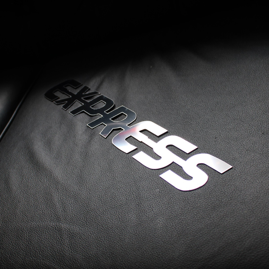 Emblema EXPRESS in acciaio inox lucidato a specchio, cosiddetto cromato.