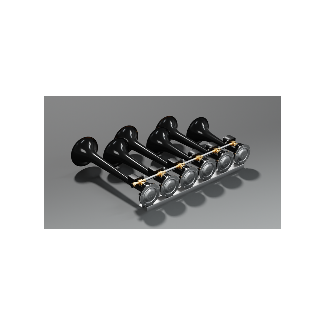Segnale pneumatico Basuri versione 4.0, il cosiddetto Baby Shark, con 22 melodie diverse. La fanfara funziona sia a 12 che a 24V. È necessaria la fornitura d'aria!