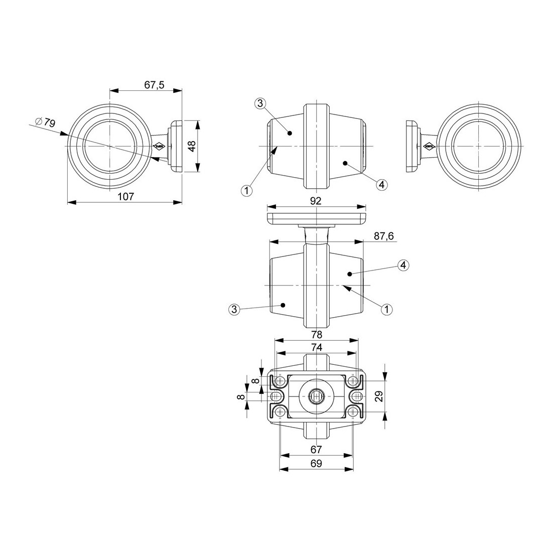 Omologazione E9, 18x LED, 12-24V, 1,2/3W, IP68, Cavo 2x075mm2 (0,6m).
