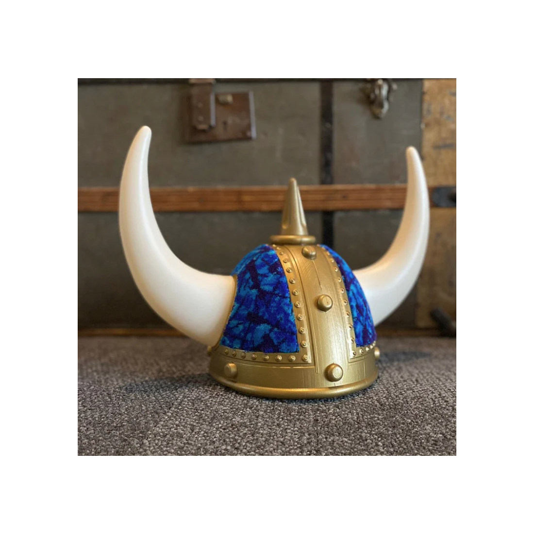 Elmo vichingo con peluche danese in blu.