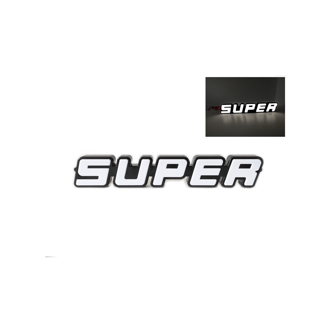 24V Wit verlichte (LED) opschrift SUPER 450x75x29 [mm] . Het geheel is gemaakt van kunststof. Eenvoudige installatie met twee schroeven in de montagegaten (schroeven worden meegeleverd). Elektriciteitskabels zijn weggewerkt. Accessoire tuning onderdeel.
