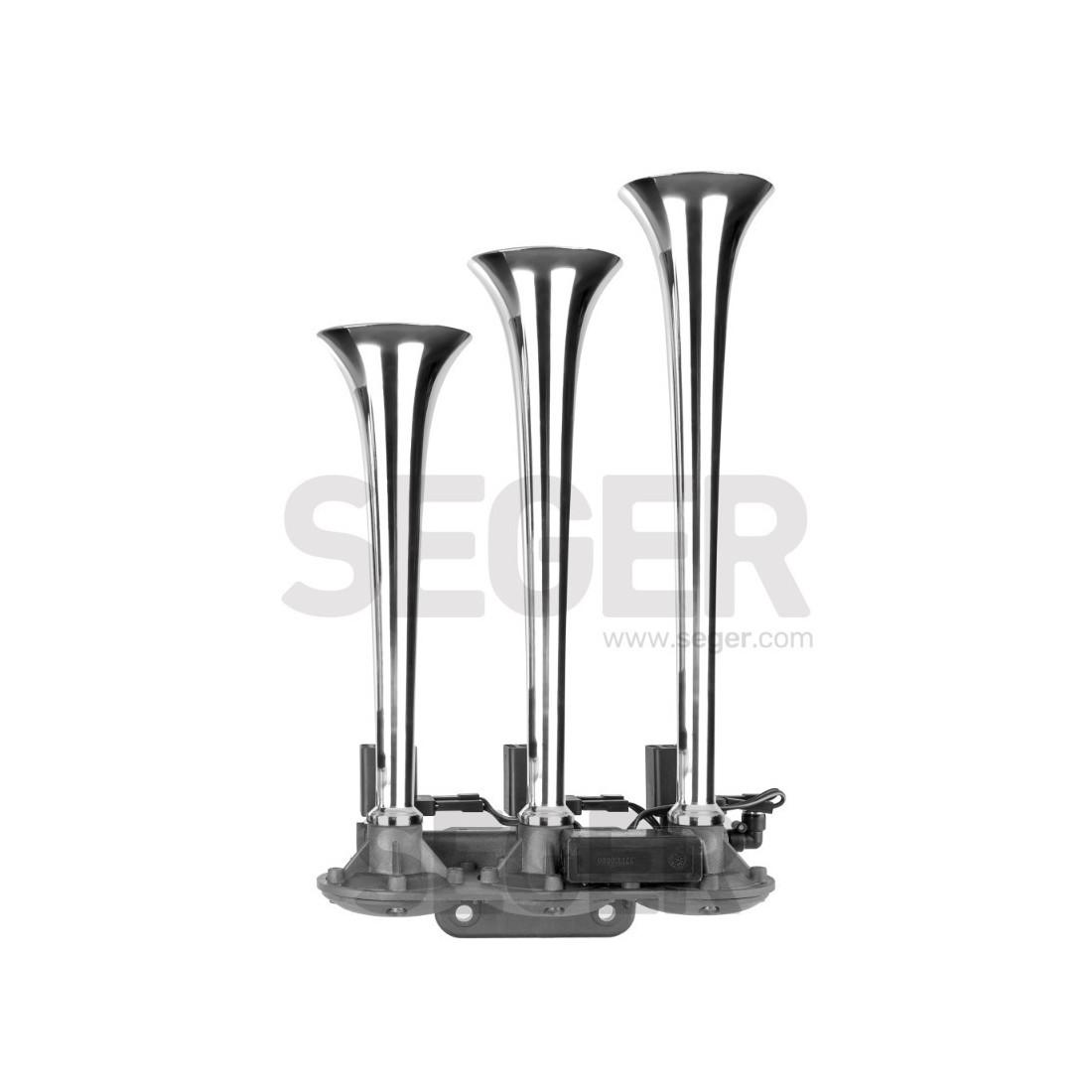 SEGER drievoudige pneumatische fanfare, metalen lopen - verchroomde afwerking, 24V magneetventiel, snelle luchtaansluiting, elektrische aansluitingen, montagebeugel.