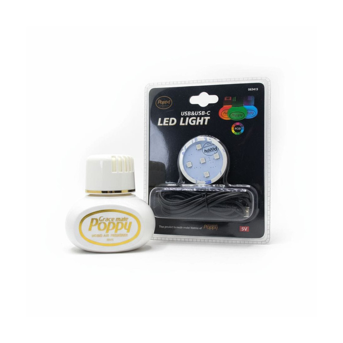 -Meerkleurige achtergrondverlichting met USB- en USB-C -aansluiting , meestal gebruikt om "Poppy Grace Mate"-luchtverfrissers in flessen te verlichten.