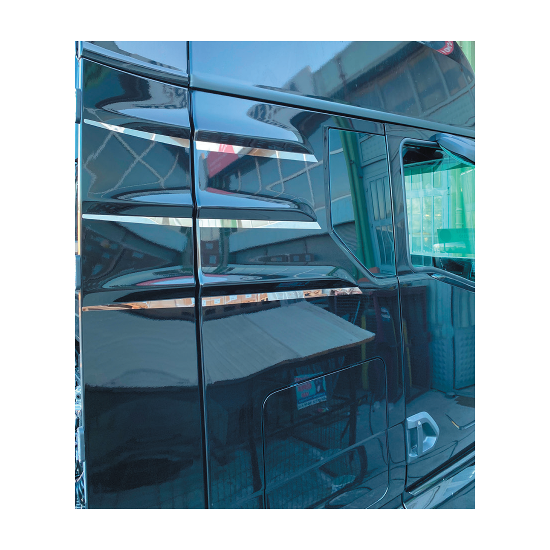 Een set sierstrips aan de zijkant van de cabine van spiegelgepolijst roestvrij staal. Op sommige foto's kan het product bedekt zijn met een grijze beschermfolie, die verwijderd kan worden om een spiegeleffect te creëren.
