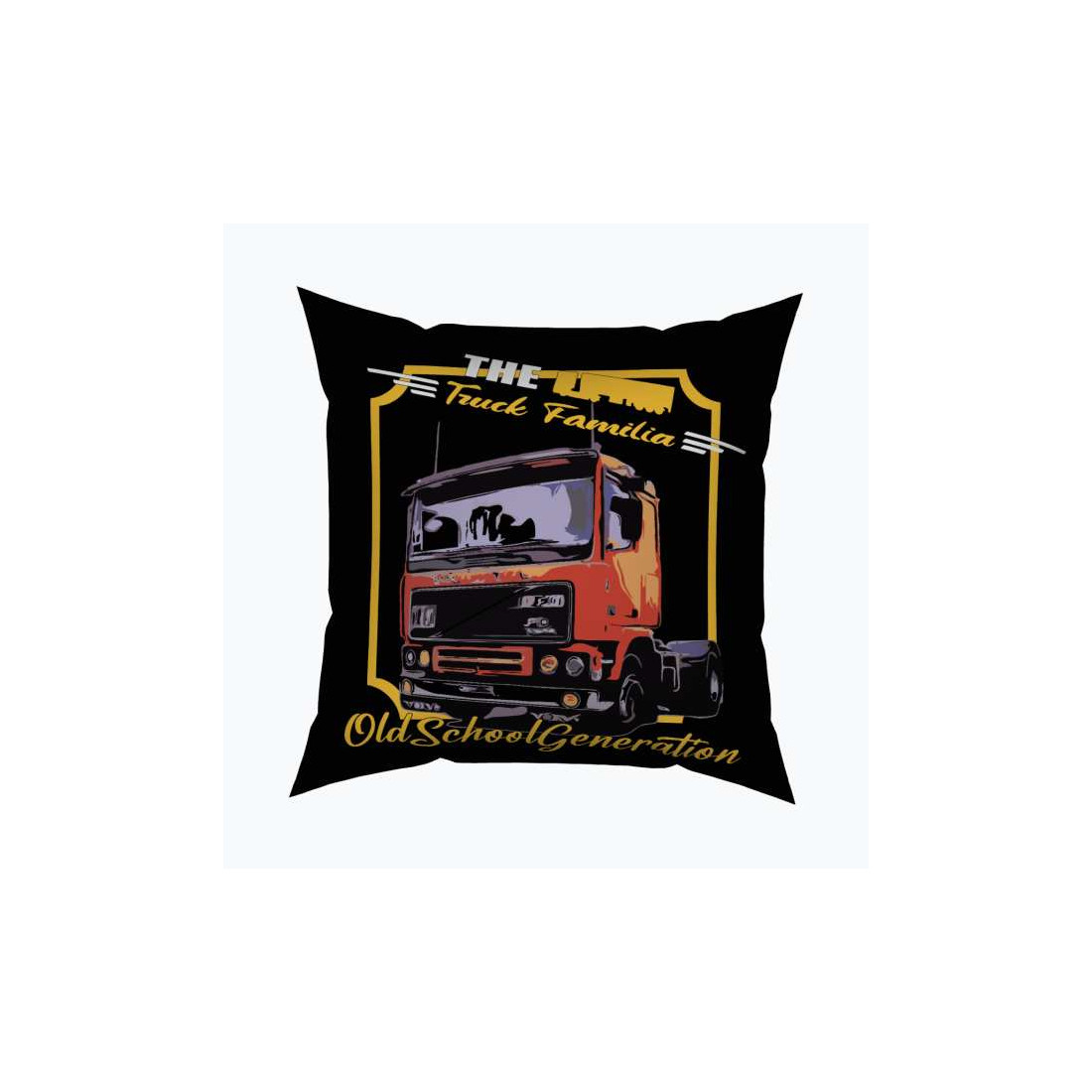 Kussen gemaakt van waterdicht materiaal.Grafisch/print - oranje "Old School Generation" vrachtwagenGrafisch aan beide zijden.Afmeting: 40x40cm.