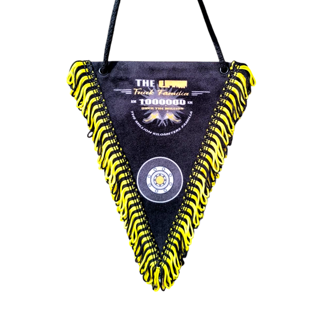 Decoratieve wimpel "1.000.000KM".Afgewerkt met decoratieve franjes.Hoogte ongeveer 25 cm.