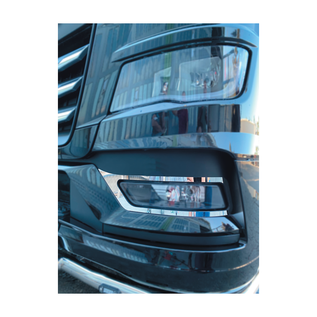 Zestaw dekoracyjnych ramek wokół lamp w zderzaku, wykonanych ze stali nierdzewnej polerowanej na lustro. Na niektórych zdjęciach produkt może znajdować się w szarej folii ochronnej, po zdjęciu której uzyskamy efekt lustra.