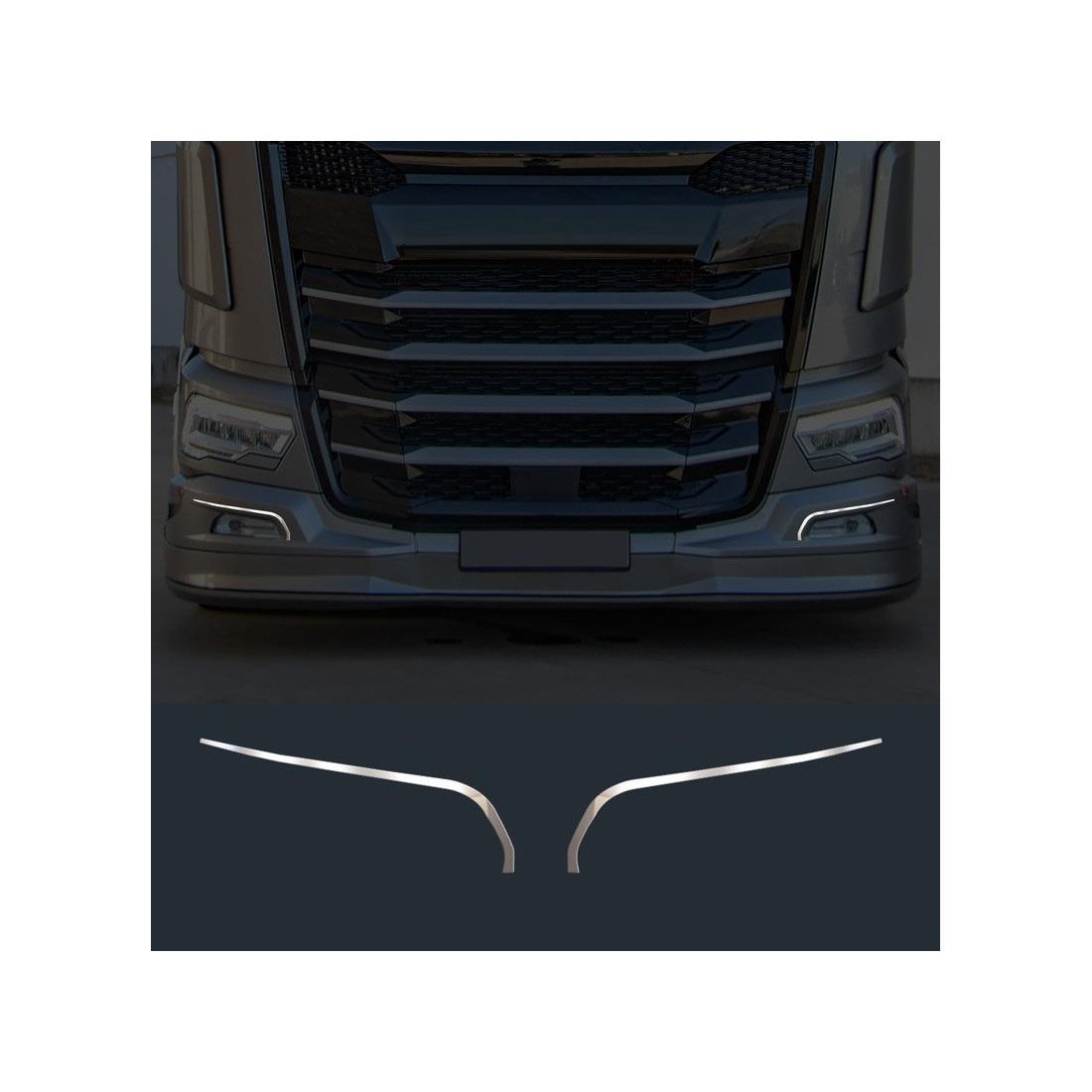 Ozdobne chromowe listwy do lamp w zderzaku, wykonane ze stali nierdzewnej polerowanej na lustro. Odpowiednie do: DAF NGD XF XG XG+.