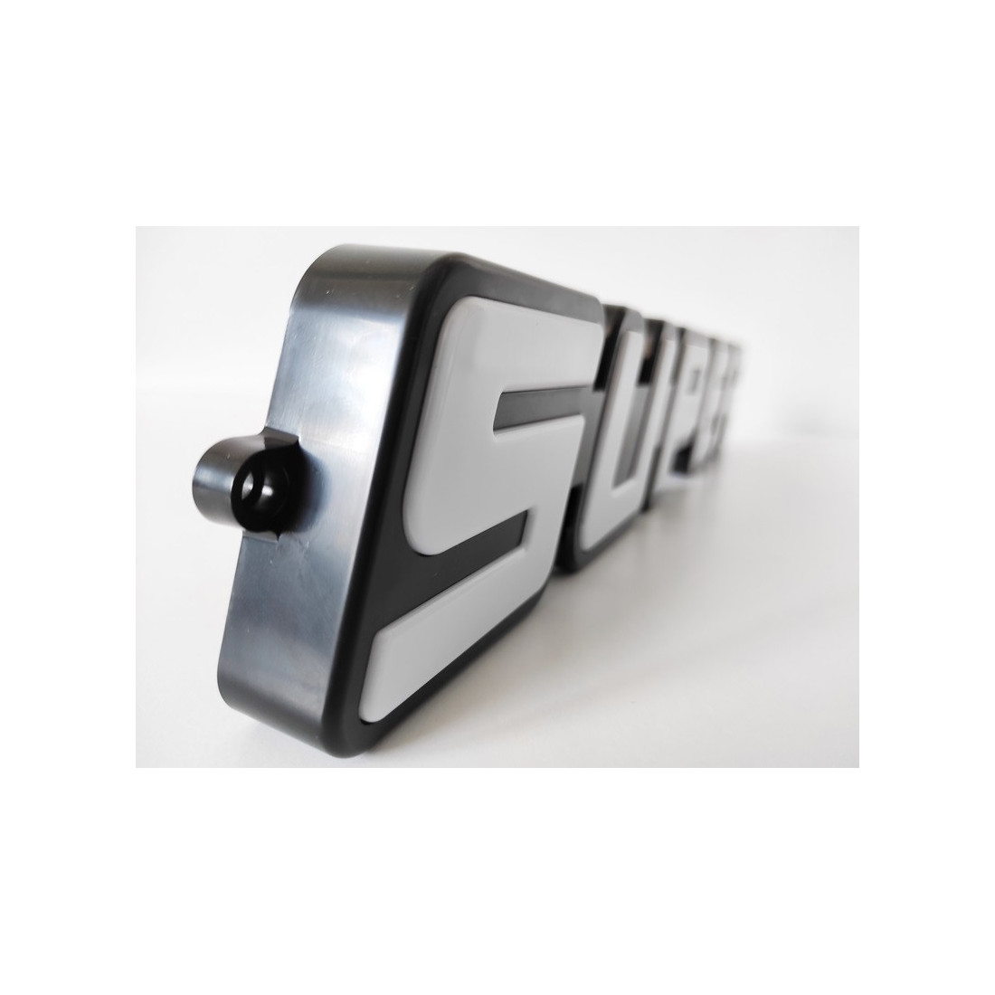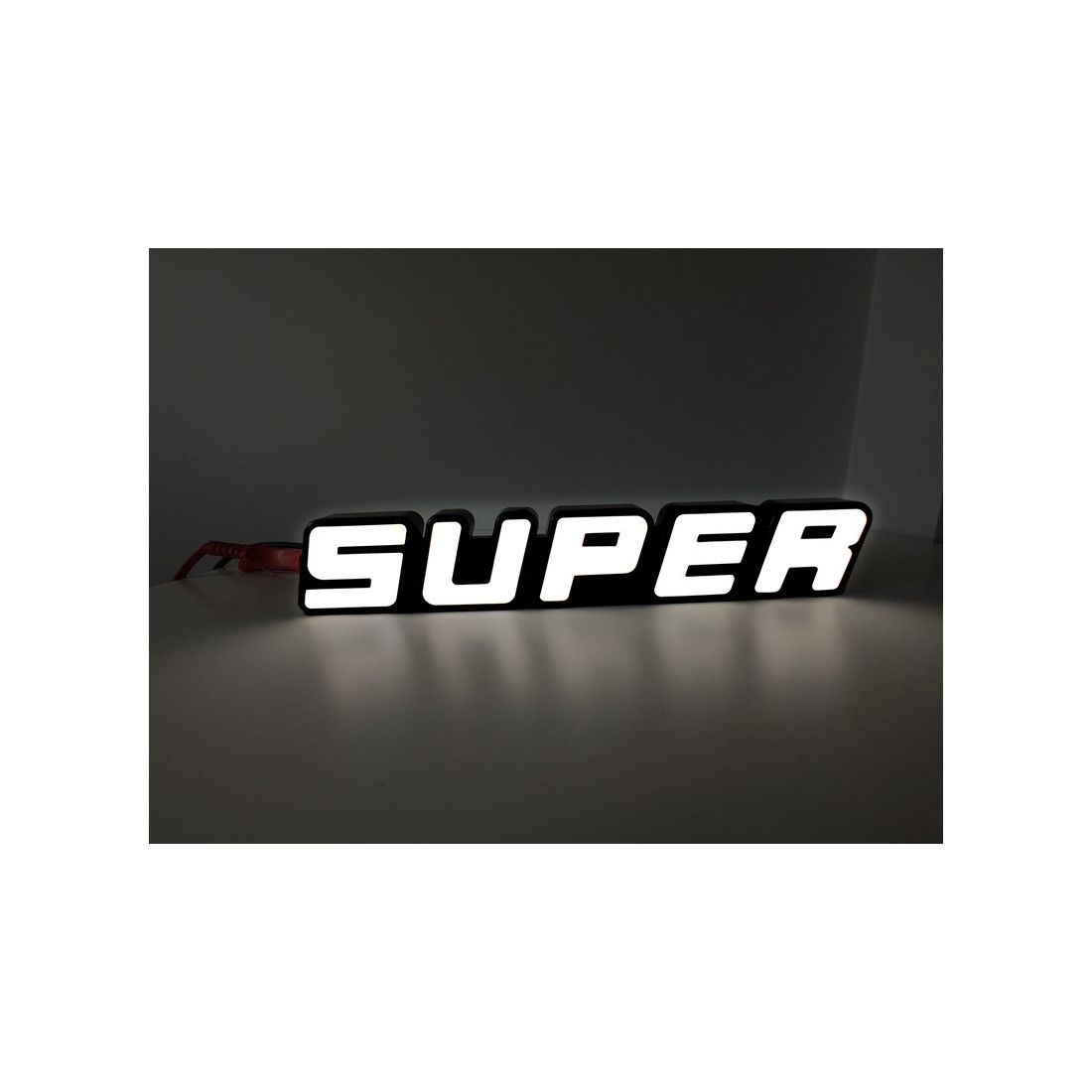 24V Podświetlany na biało (LED) napis S-U-P-E-R 450x75x29 [mm]. Całość wykonana z tworzywa sztucznego. Prosty montaż na dwie śrubki w otworach montażowych (śruby są w zestawie). Wyprowadzone przewody elektryczne. Akcesoryjna część tuningowa.