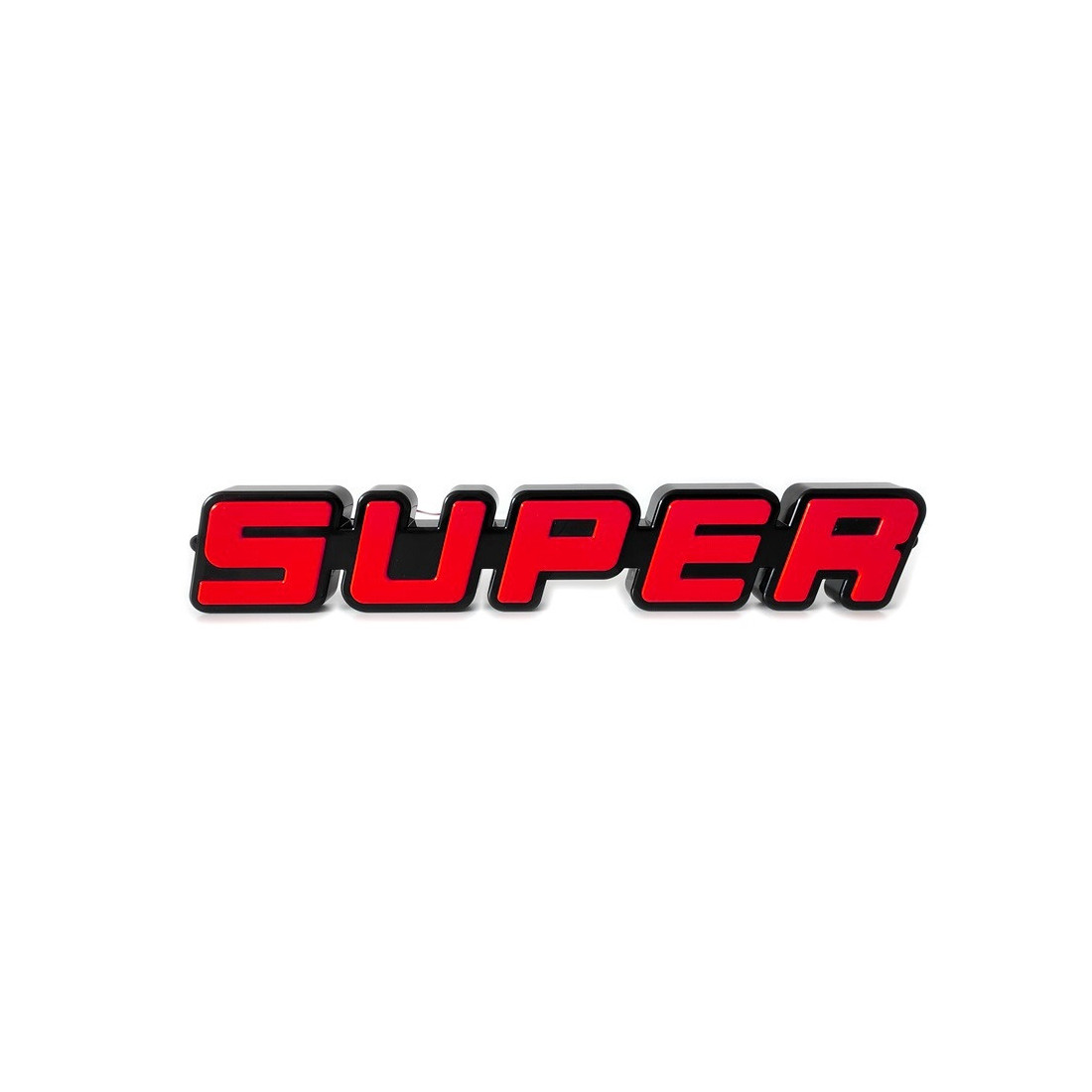 24V Podświetlany na CZERWONO (LED) napis S-U-P-E-R 450x75x29 [mm]. Całość wykonana z tworzywa sztucznego. Prosty montaż na dwie śrubki w otworach montażowych (śruby są w zestawie). Wyprowadzone przewody elektryczne. Akcesoryjna część tuningowa.