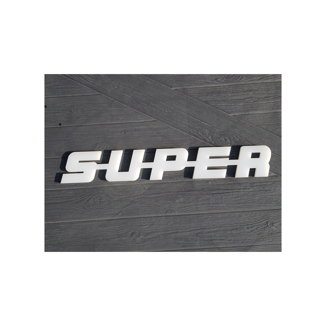 Emblemat plastikowy SUPER o wymiarach: 40 x 6 x 0,8 [cm]. Produkt najczęściej montowany w pojazdach SCANIA na masce. Montaż na taśmę dwustronną lub klej (brak w zestawie).