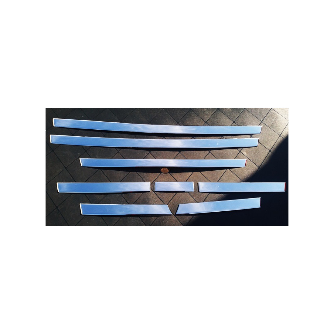 Zestaw chromowych dekorów - listwy tłoczone (3D) na fabryczny grill wykonane ze stali nierdzewnej polerowanej na lustro (304). Montaż na taśmie dwustronnej (jest w zestawie). Przeznaczone do samochodów DAF XF E6 od 2013 roku.