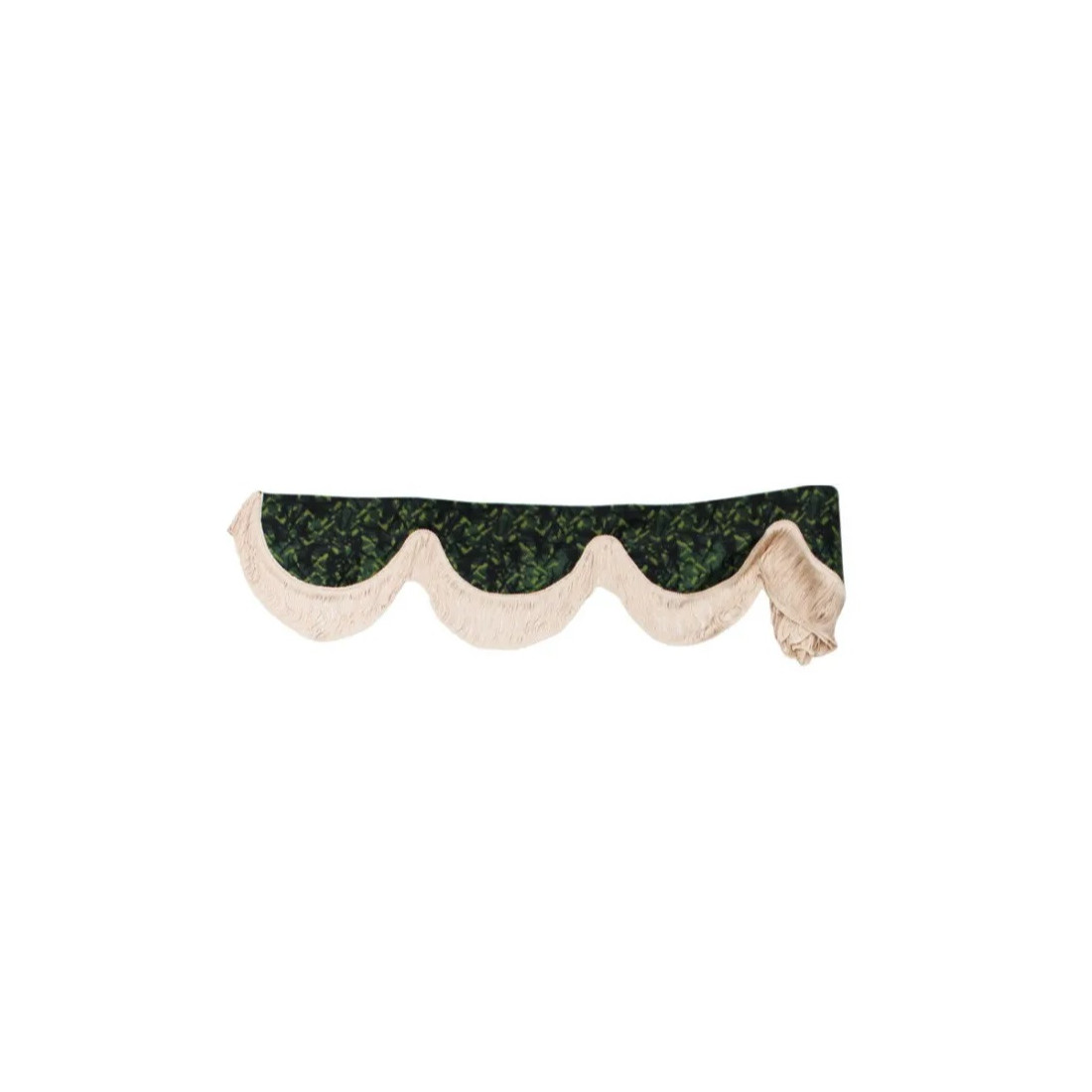 Falbana nad przednią szybę (od zewnątrz i od wewnątrz ZIELONY materiał pluszowy w stylu duńskim DP03, BEŻOWE frędzle) wraz z rzepem montażowym.