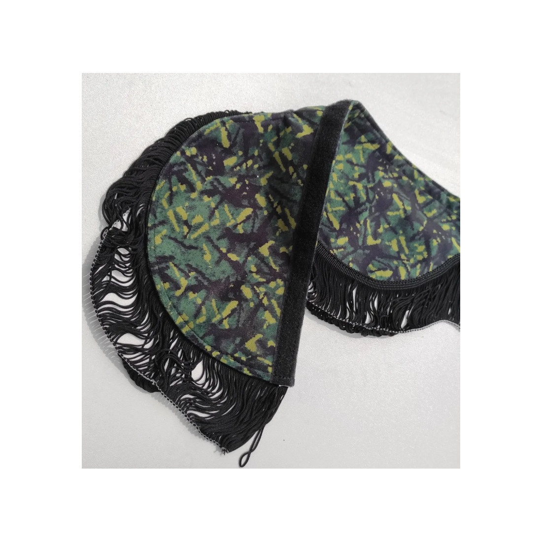 Vindrutekappa (ut- och invändigt GRÖNT plyschtyg i dansk stil DP03, SVARTA fransar) med kardborreband.